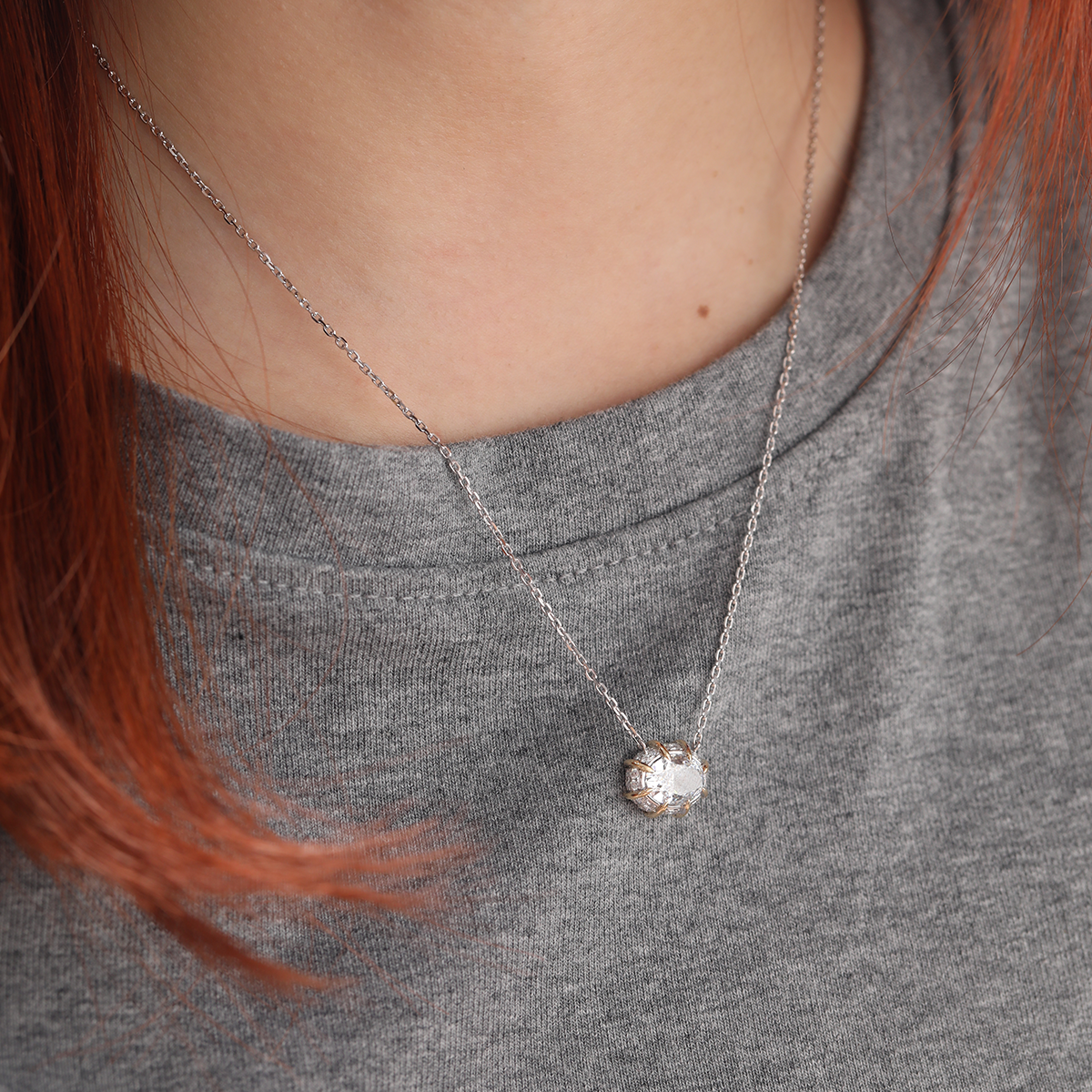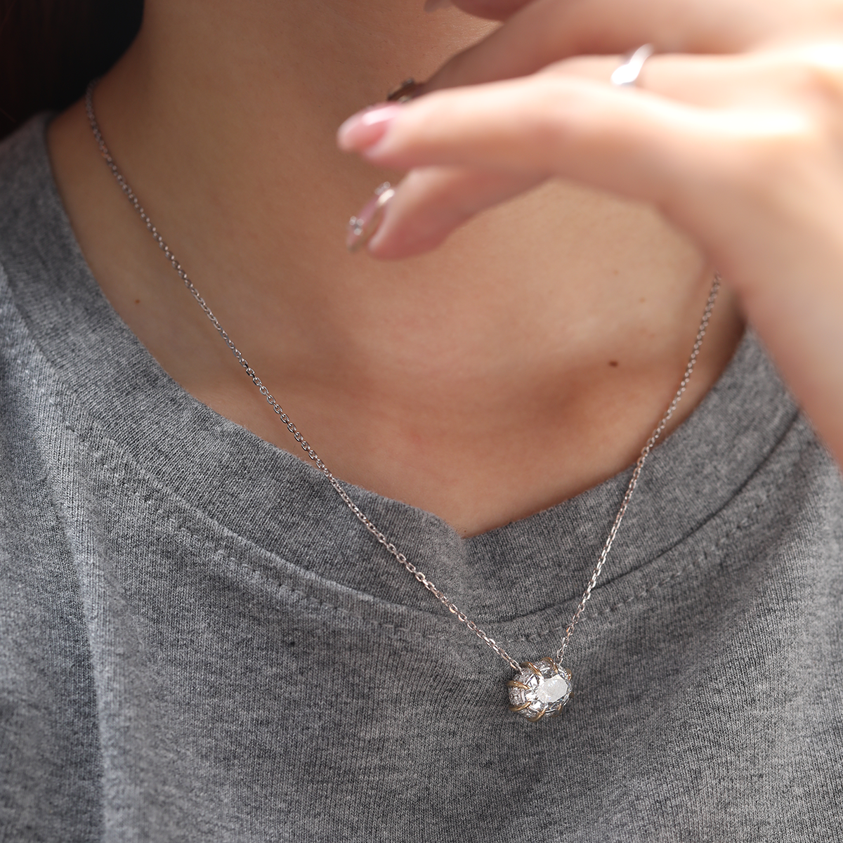 This pendant radiates timeless brilliance, featuring a 2.5ct oval cut lab-grown diamond framed by a halo of pavé diamonds. Crafted in two-tone 14K yellow and white gold, it marries warmth and luminosity in one elegant design. Suspended on a delicate chain, it’s a versatile statement of romance and refinement — perfect for everyday elegance or a sparkling evening look.