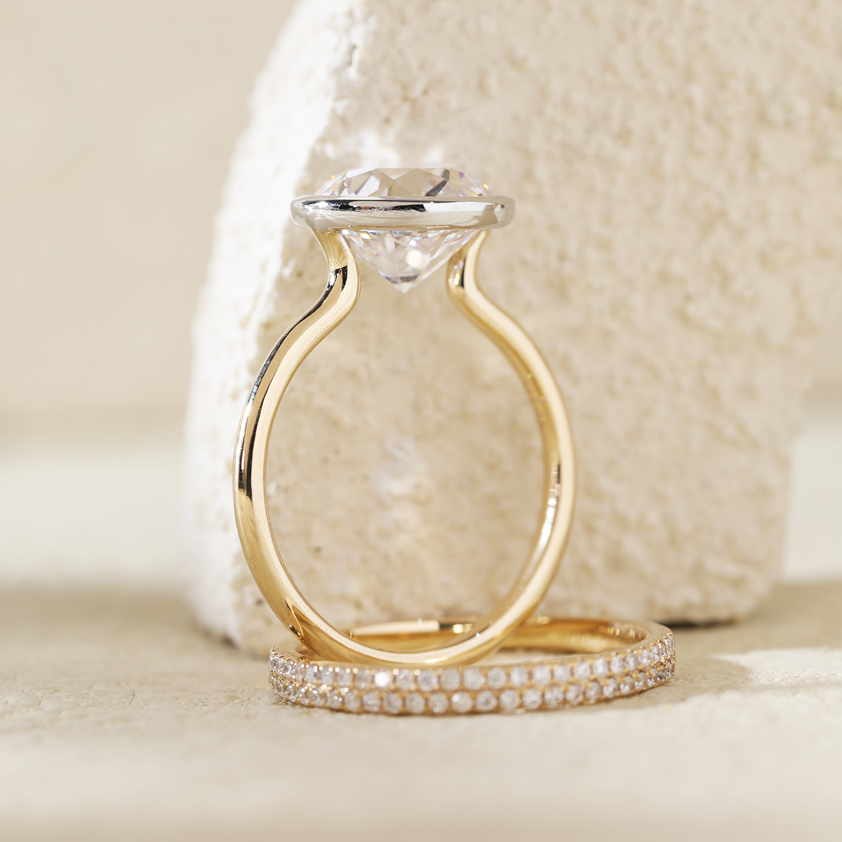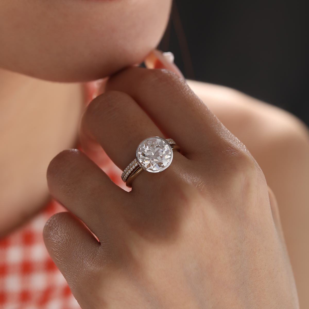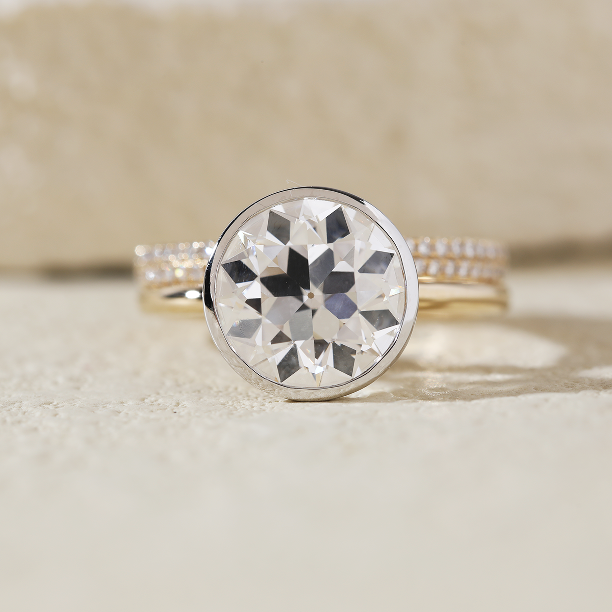 Celebrate timeless romance with our 14K Yellow and White Gold Bridal Ring Set. The engagement ring features a stunning 3.5ct Old European Cut lab-grown diamond, bezel-set for a vintage-inspired look that’s both secure and elegant. The warm yellow gold bezel contrasts beautifully with the white gold band, highlighting the stone’s antique charm. Paired with a matching half eternity wedding band adorned with two rows of round lab-grown diamond pavé, this set offers brilliance from every angle. Perfect for those seeking a unique, heirloom-style engagement ring with modern ethical craftsmanship.