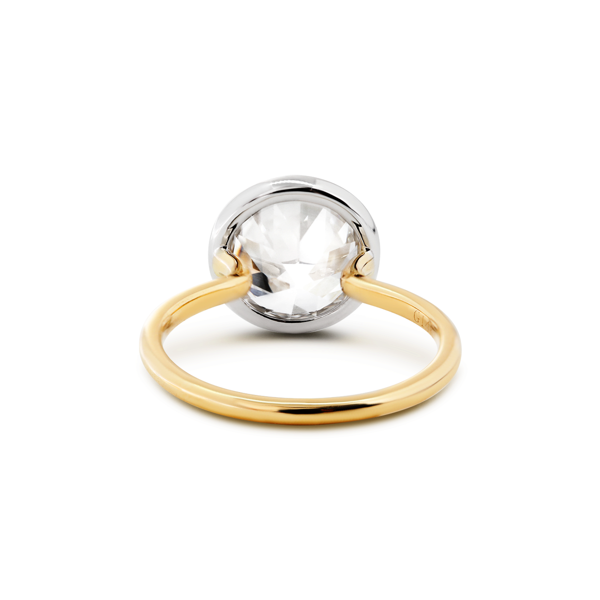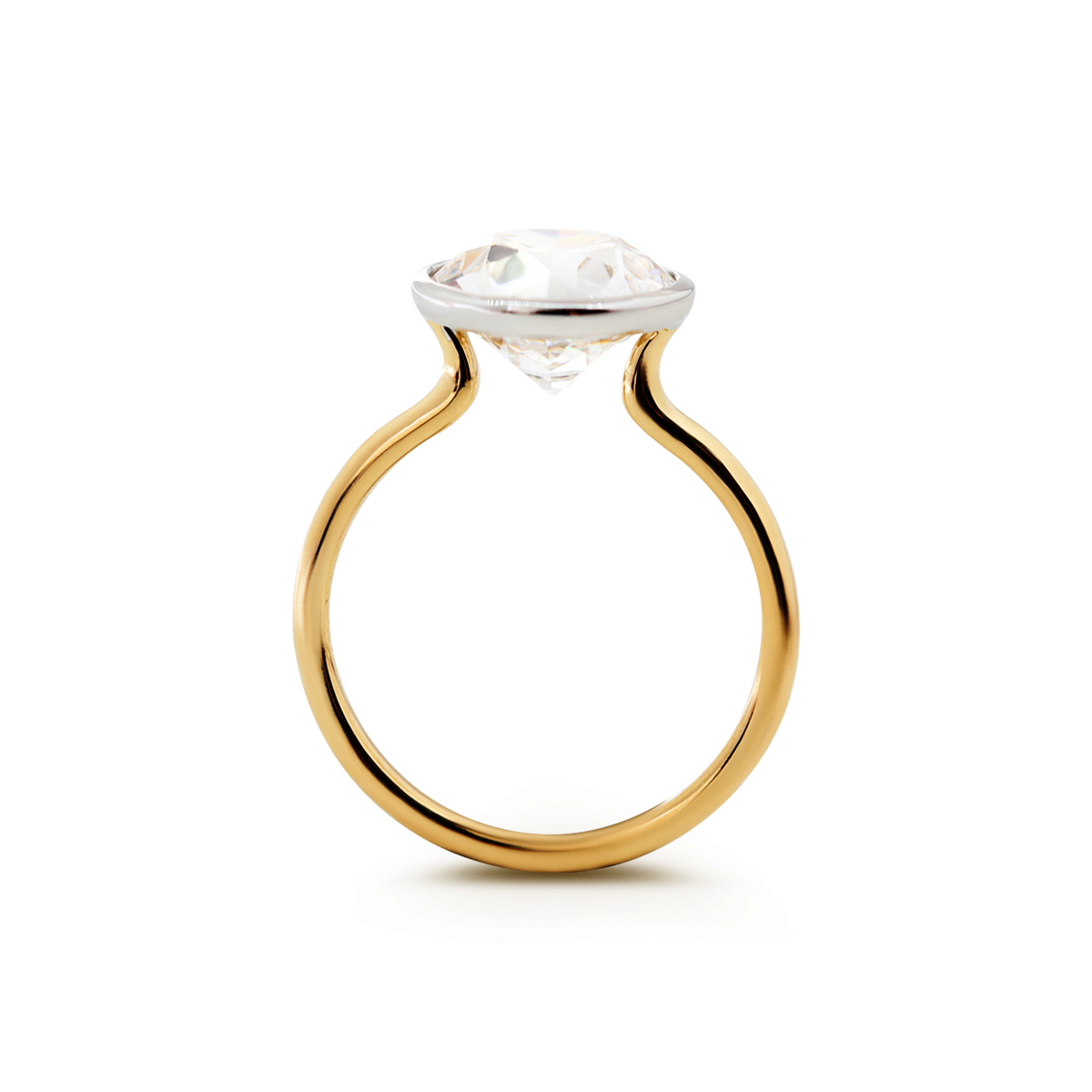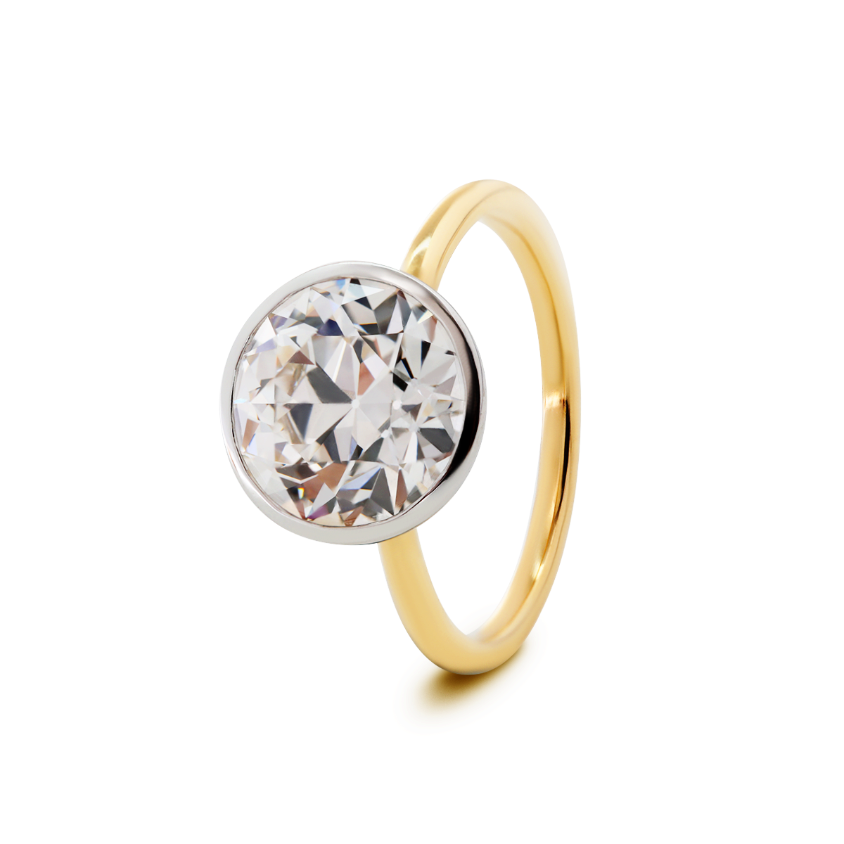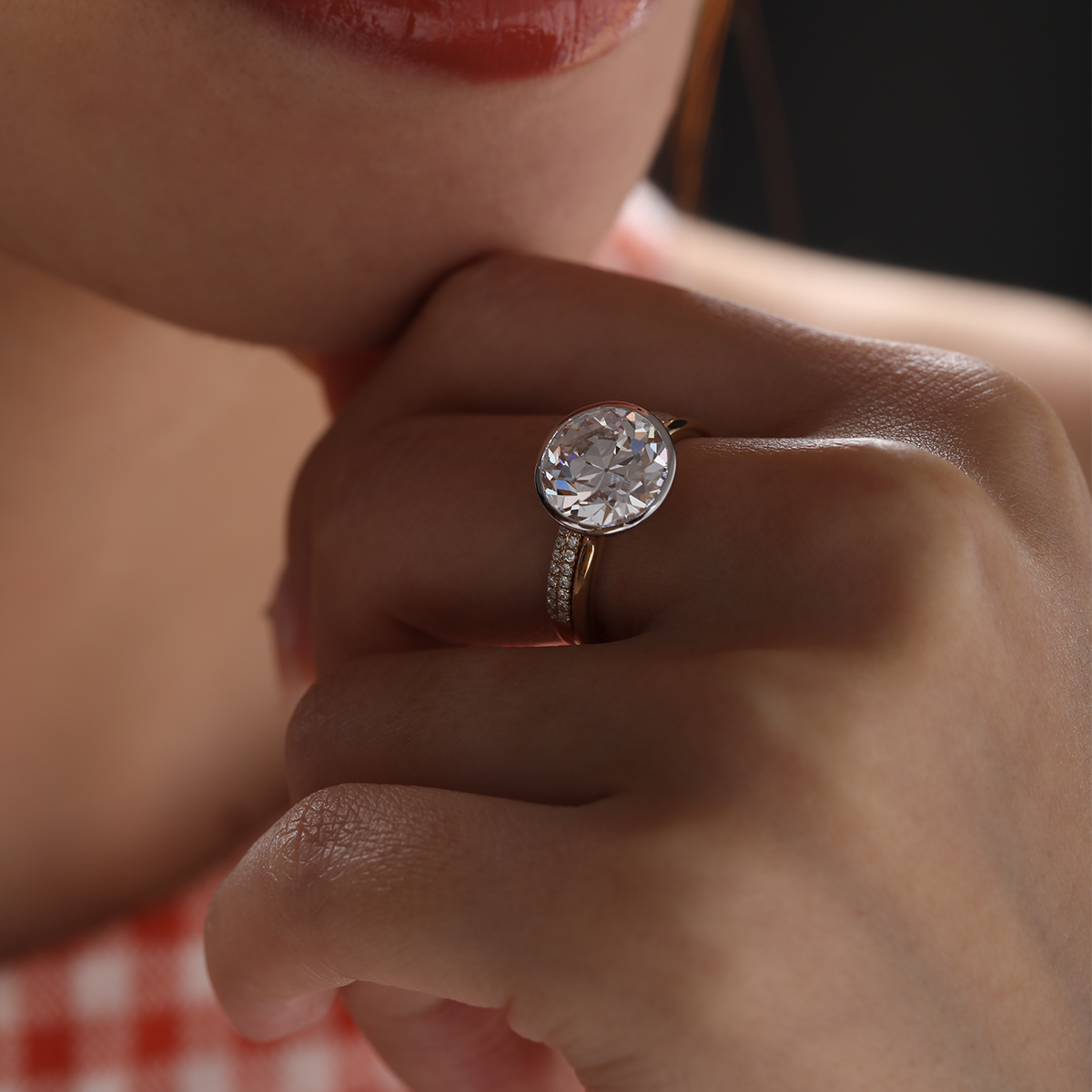 Celebrate timeless romance with our 14K Yellow and White Gold Bridal Ring Set. The engagement ring features a stunning 3.5ct Old European Cut lab-grown diamond, bezel-set for a vintage-inspired look that’s both secure and elegant. The warm yellow gold bezel contrasts beautifully with the white gold band, highlighting the stone’s antique charm. Paired with a matching half eternity wedding band adorned with two rows of round lab-grown diamond pavé, this set offers brilliance from every angle. Perfect for those seeking a unique, heirloom-style engagement ring with modern ethical craftsmanship.