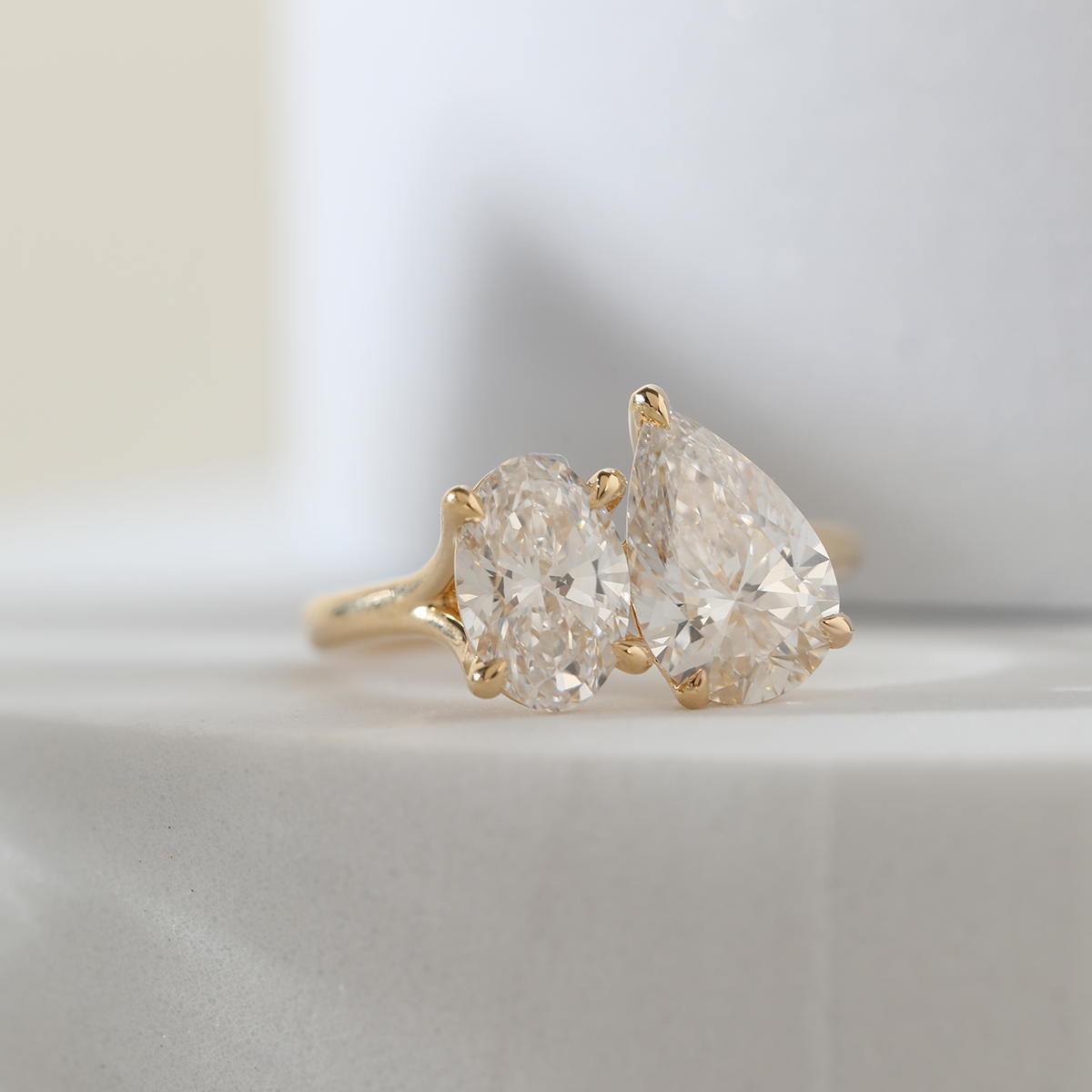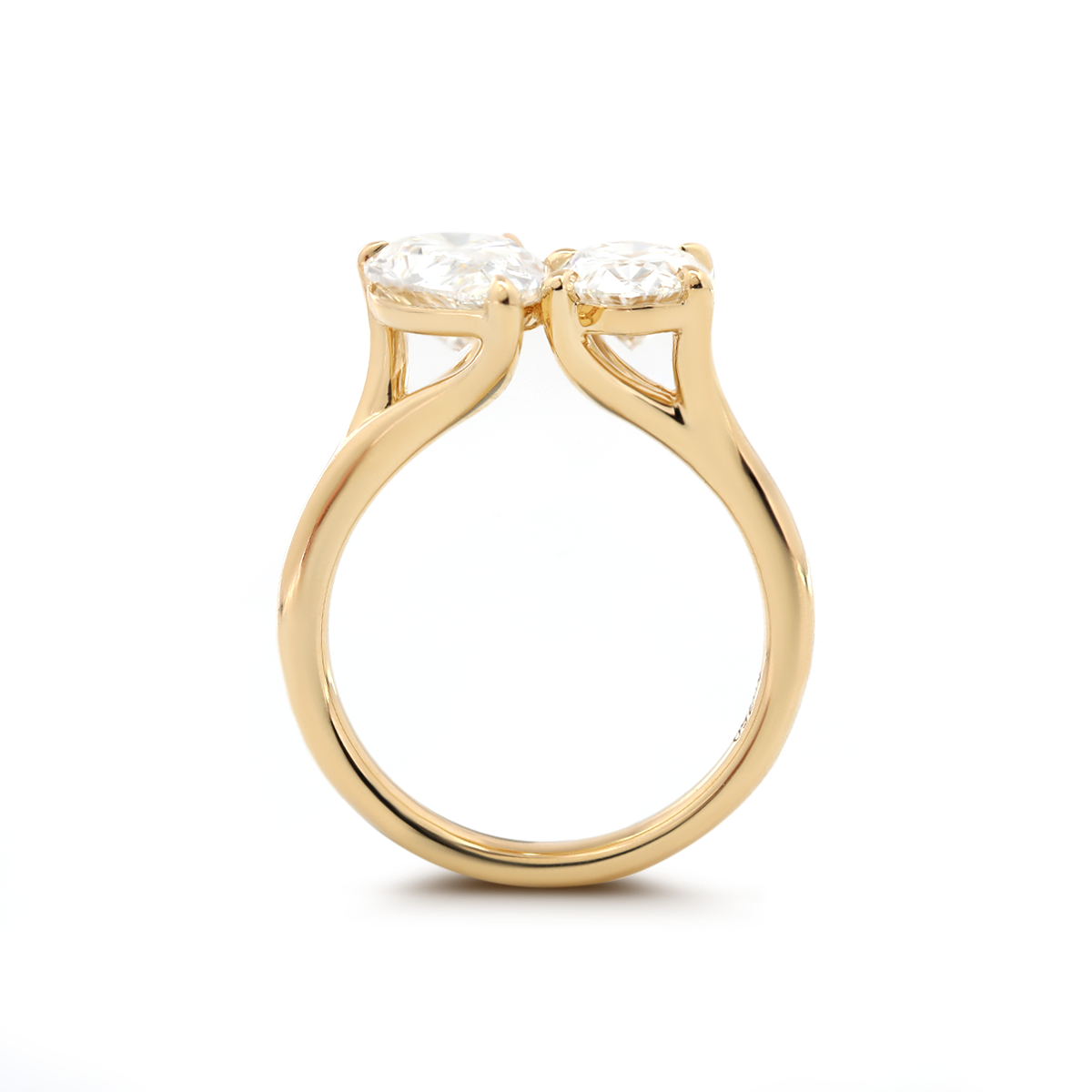 Graceful and symbolic, our 18K Yellow Gold Toi et Moi Ring features an elegant pairing of an oval and a pear lab-grown diamond—representing two souls in perfect harmony. Set in a sleek open design, the contrasting shapes create visual balance and modern romance, while the rich yellow gold band adds timeless warmth. Perfect as a unique engagement ring or a meaningful statement piece, this ring is ideal for those seeking Toi et Moi designs, mixed-shape diamond rings, or sustainable fine jewelry with poetic charm.