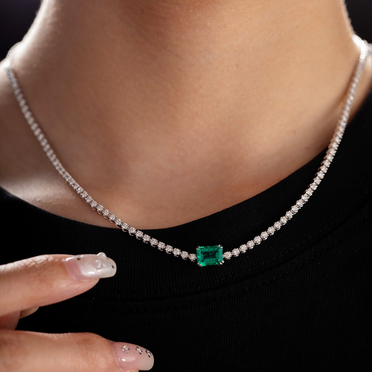 Refined elegance meets vibrant color in our 14K White Gold Tennis Necklace, featuring a continuous line of 1.8mm round lab-grown diamonds and a captivating 8×6mm lab-grown emerald centerpiece. The sleek silhouette is elevated by the rich green emerald, creating a modern twist on a classic design. Crafted for everyday luxury or statement occasions, this necklace is perfect for those searching for lab diamond tennis necklaces, emerald center jewelry, or sustainable fine pieces that blend timeless brilliance with bold sophistication.