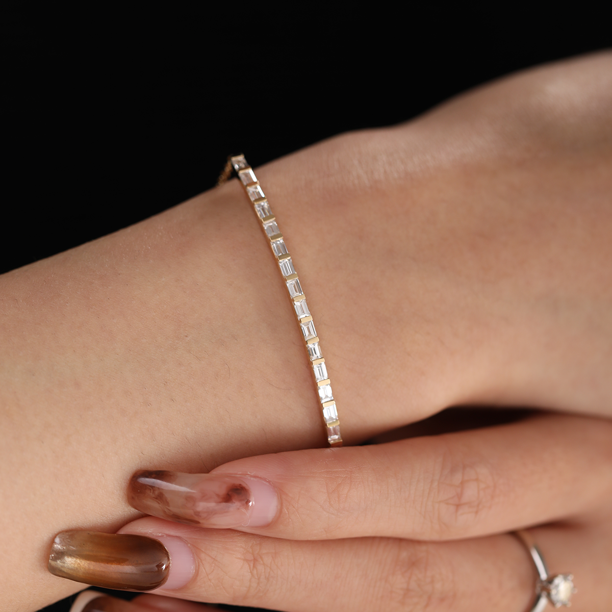 Sleek, modern, and endlessly elegant—our 14K Yellow Gold Bangle Bracelet features a row of baguette cut lab-grown diamonds, precisely set to highlight their clean lines and reflective sparkle. The polished yellow gold bangle adds warmth and structure, making it perfect for both stacking and standalone wear. Designed for those who love minimalist luxury, this piece is ideal for shoppers seeking lab diamond bangles, baguette diamond bracelets, or timeless, sustainable fine jewelry with a bold edge.