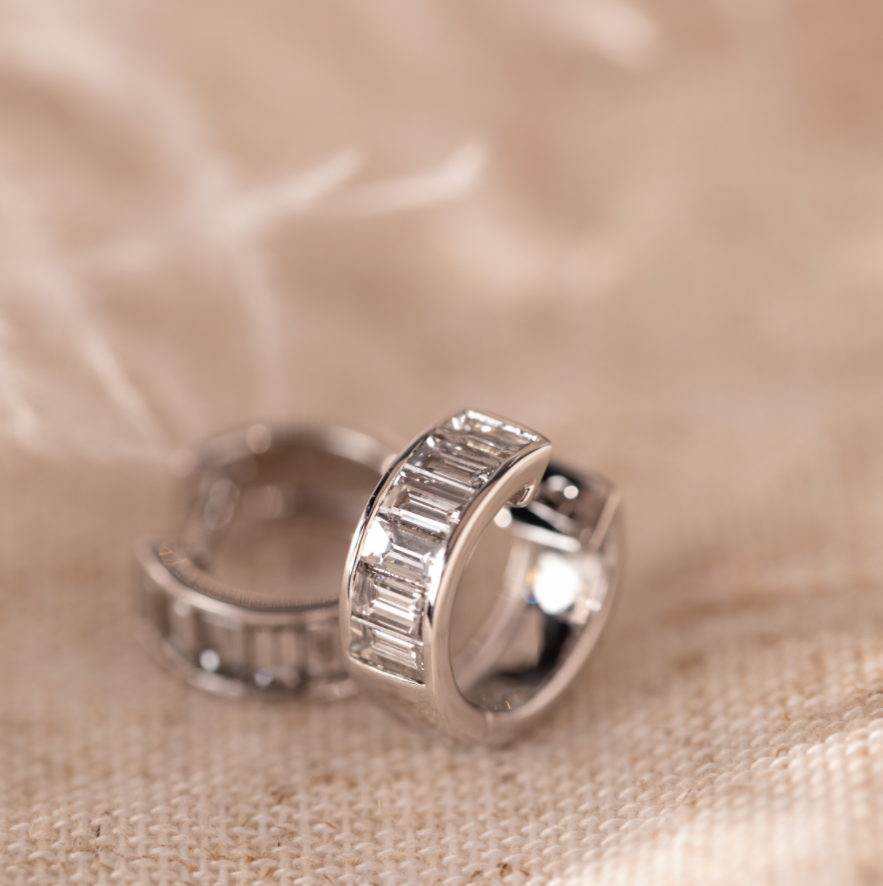 Enhance your style with the 14K White Gold Baguette Cut Lab Diamond Channel Setting Huggie Earrings. These elegant earrings feature baguette-cut lab diamonds, set in a sleek channel design that showcases their clean, modern lines and brilliant sparkle.