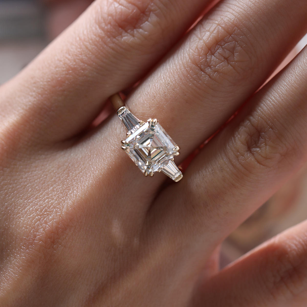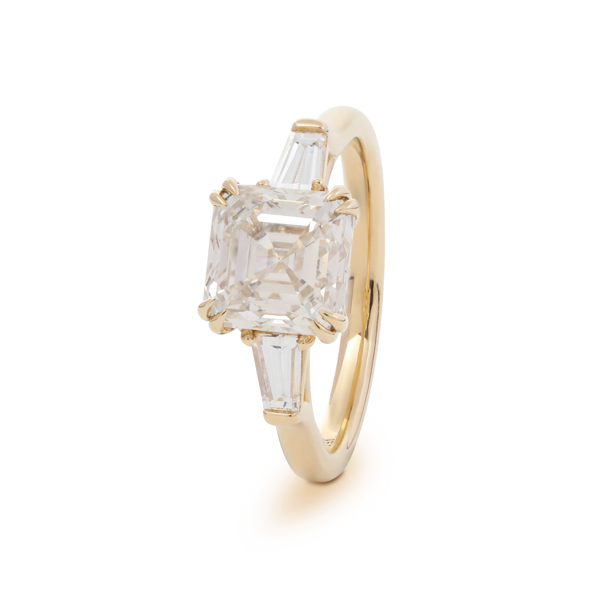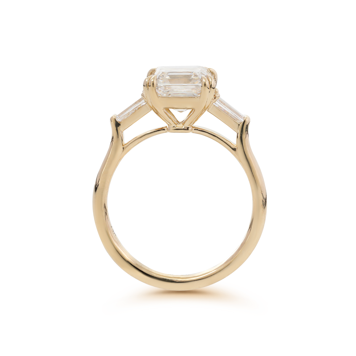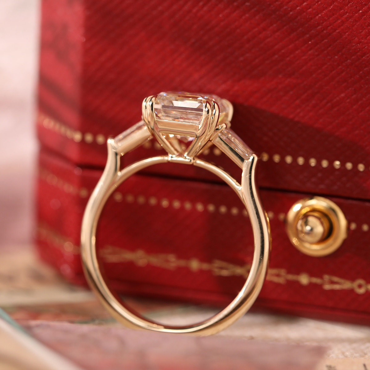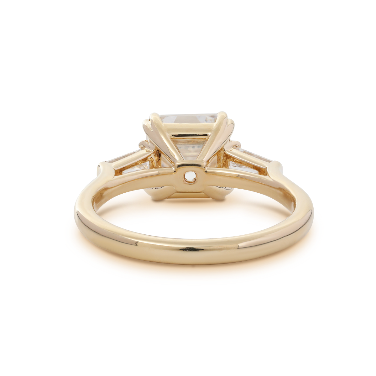 Elevate your jewelry collection with this 14K Yellow Gold 3.5ct Asscher Cut Lab Diamond Three-Stone Ring. The mesmerizing Asscher-cut lab diamond, set with double claw prongs, radiates vintage sophistication and exceptional brilliance. Flanked by two tapered baguette-cut lab diamonds, this design embodies timeless elegance with a modern twist. The 14K yellow gold band enhances the warmth and contrast of the diamonds, creating a luxurious and refined look. Perfect for engagements, anniversaries, or as a statement piece, this three-stone lab diamond ring symbolizes past, present, and future love, making it an unforgettable addition to any jewelry collection.