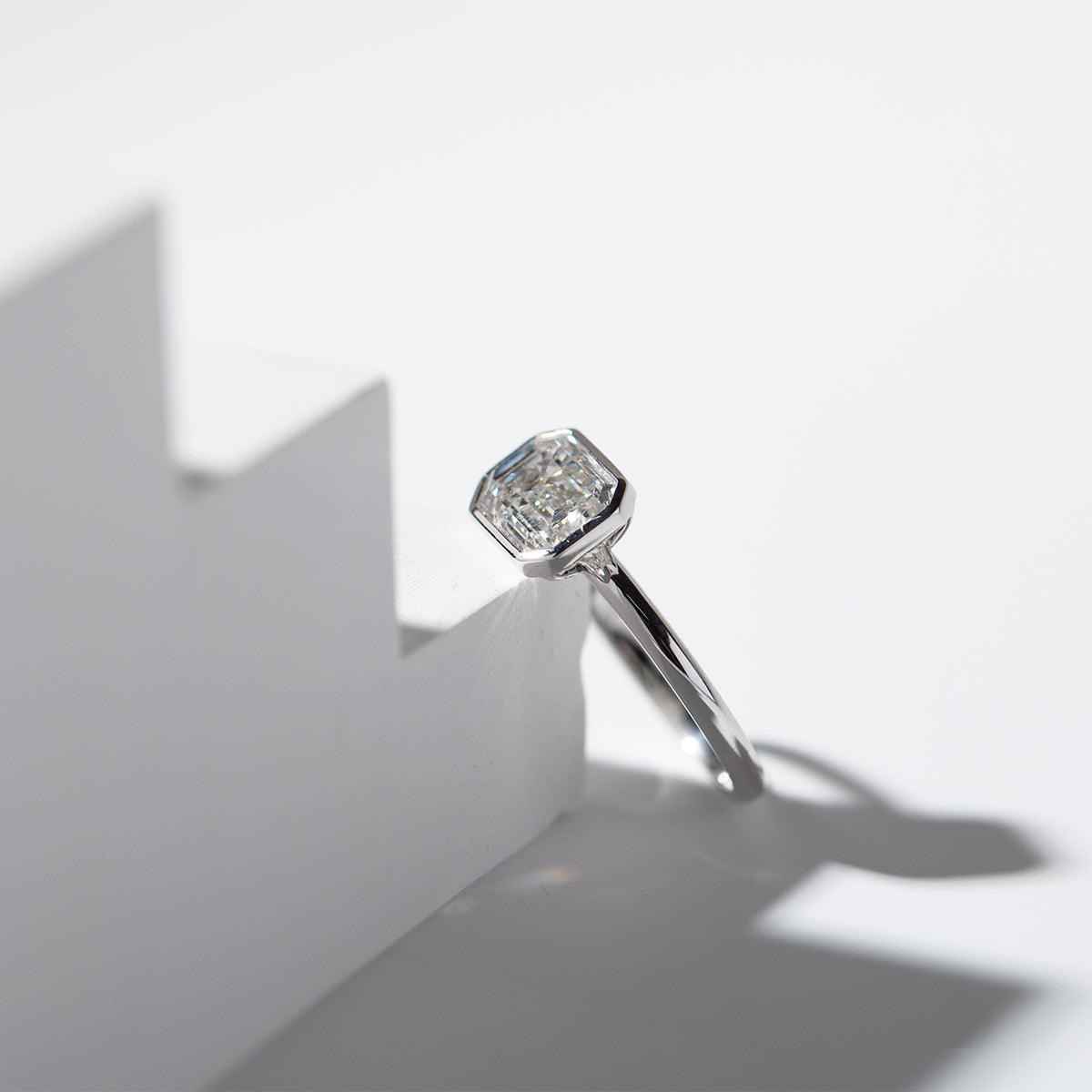 Sleek and timeless, this 14K white gold ring highlights a striking 2-carat emerald cut lab diamond in a modern bezel setting. The clean lines of the emerald cut enhance the stone’s natural brilliance, while the full bezel offers both elegance and durability. Perfectly balanced between contemporary minimalism and classic sophistication, this solitaire design makes a powerful statement of love and individuality. Ethically crafted with lab-created diamonds, it ensures beauty with responsibility. Whether chosen as an engagement ring or a personal treasure, this piece embodies refined simplicity and everlasting elegance.