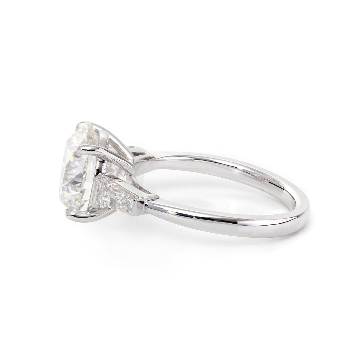 Elevate your elegance with our 14K White Gold 4ct Round Cut Lab Diamond Tapered Three-Stone Ring. This timeless design showcases a dazzling 4-carat round-cut lab diamond as the centerpiece, flanked by two tapered side stones that beautifully enhance its brilliance and create a sleek, elongated silhouette.