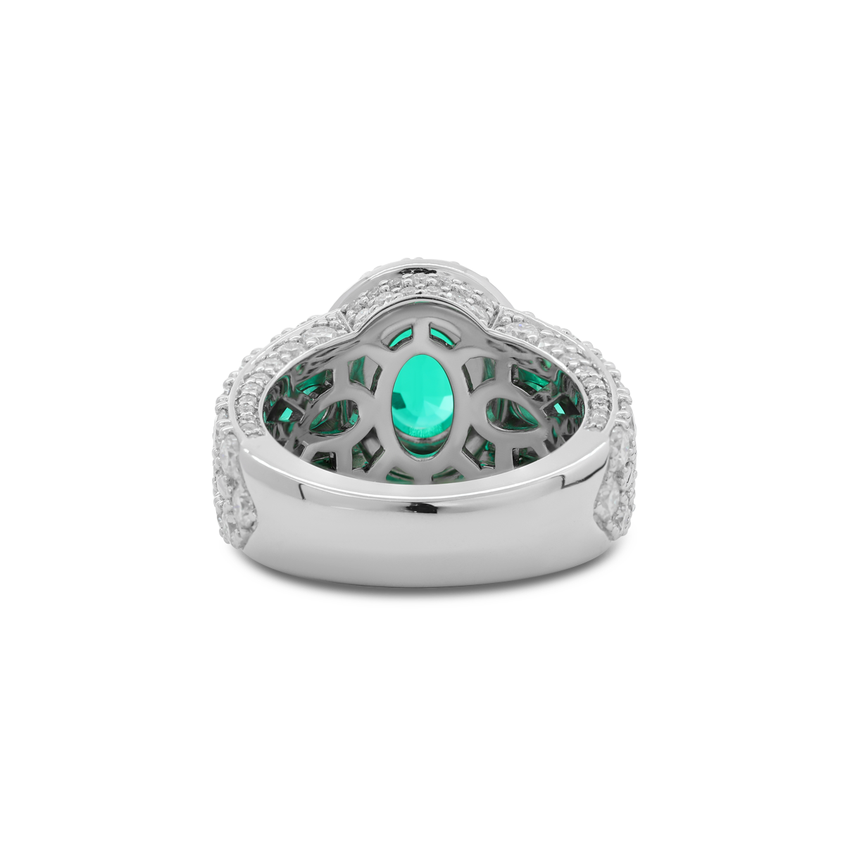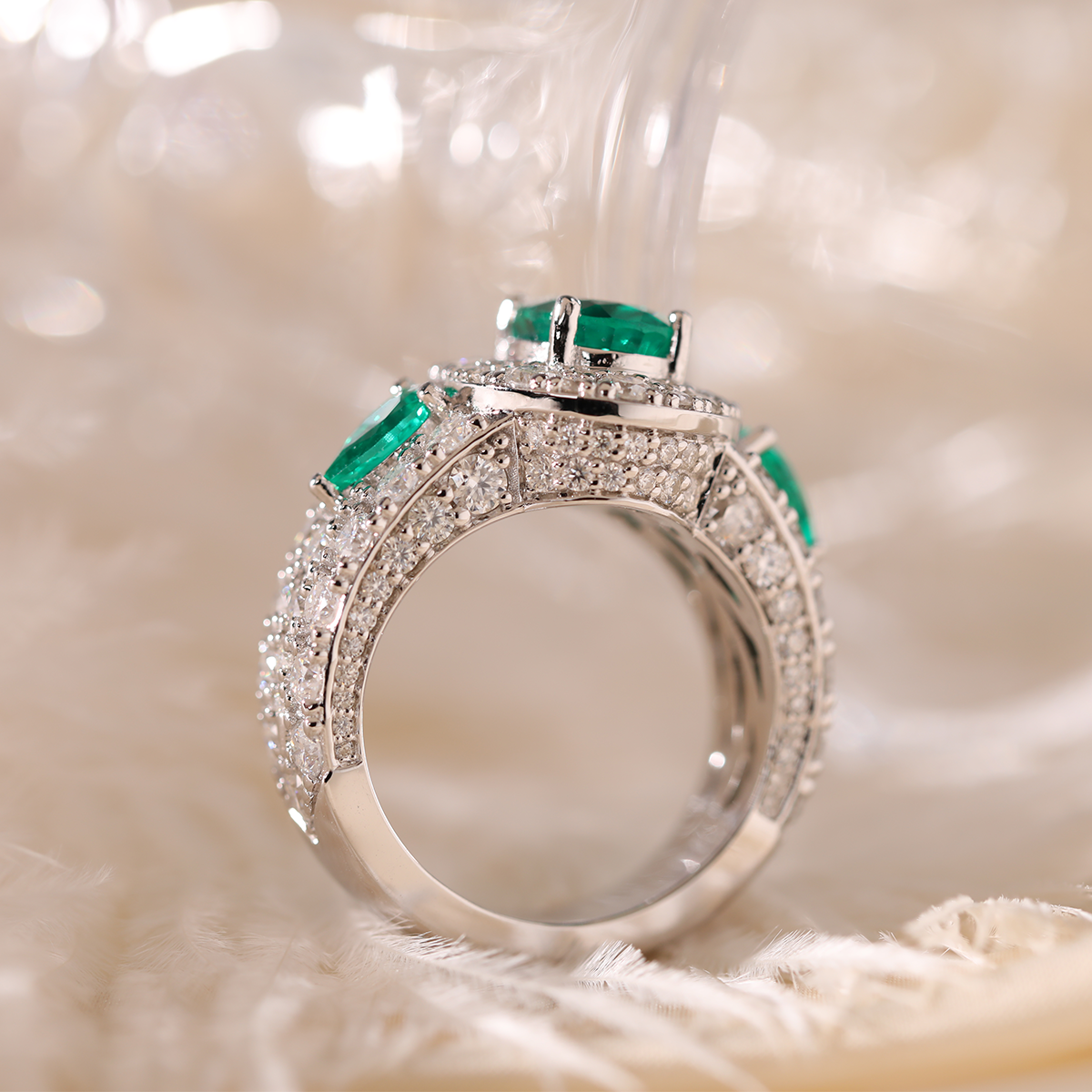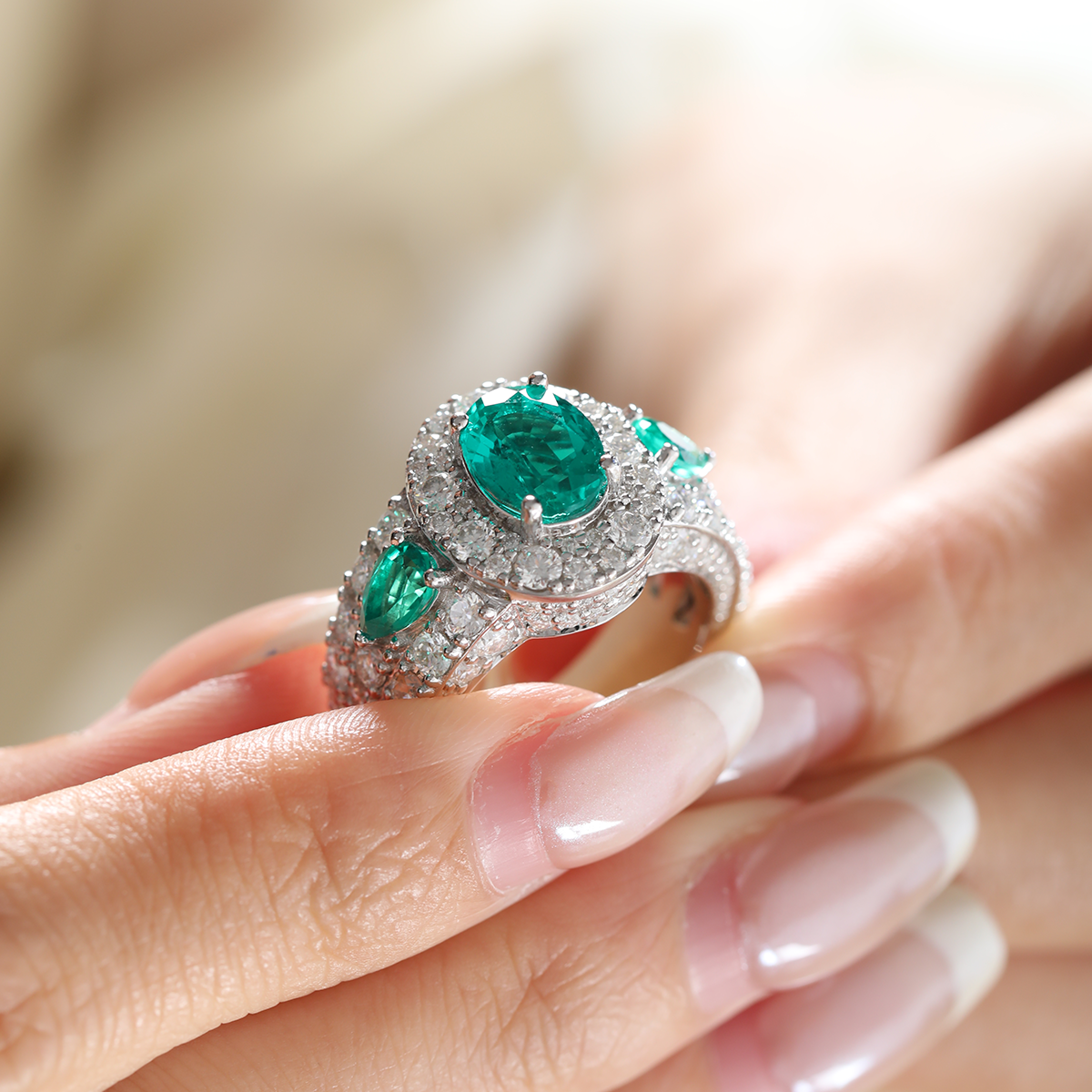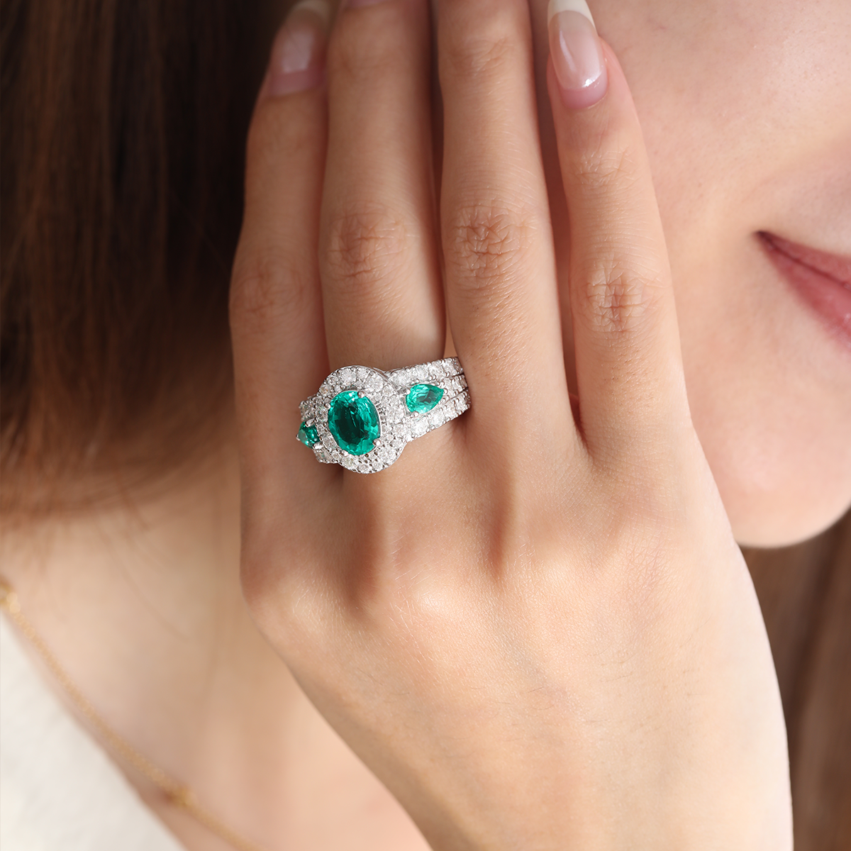 Step into timeless elegance with our 14K White Gold 9x7mm Oval Colombian Lab Emerald Vintage Ring. The rich green lab-grown emerald takes center stage, accented by pear-shaped lab emeralds and round lab diamond side-stones in a delicate pavé setting. Crafted in luminous 14K white gold, this vintage-inspired design radiates classic sophistication with a modern, ethical twist. Perfect as a unique engagement ring, anniversary gift, or heirloom-style piece. Ideal for those searching for vintage emerald rings, lab-created gemstone jewelry, or white gold statement rings with exquisite detail and vibrant color.