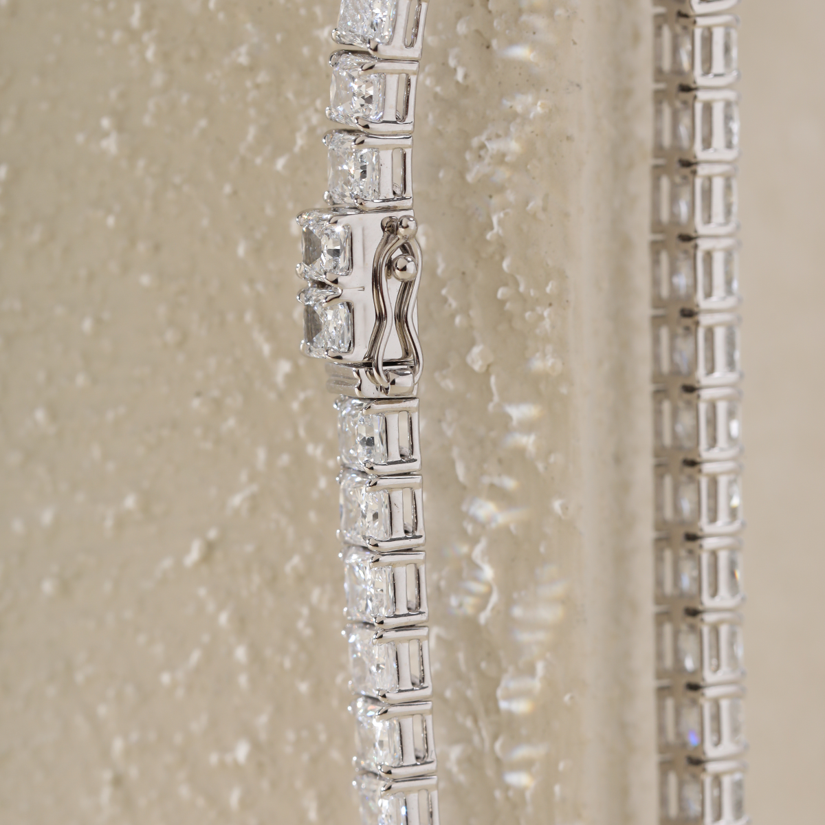 Sleek and luminous, our 14K White Gold Tennis Bracelet features a continuous line of radiant cut lab-grown diamonds, each expertly set in secure 4-claw prong basket settings. The radiant cut offers a perfect blend of brilliance and elegance, while the polished white gold adds a cool, modern finish. Ideal for adding refined sparkle to any occasion, this bracelet is perfect for those seeking radiant cut tennis bracelets, lab-grown diamond luxury, or timeless fine jewelry crafted with sustainable brilliance.
