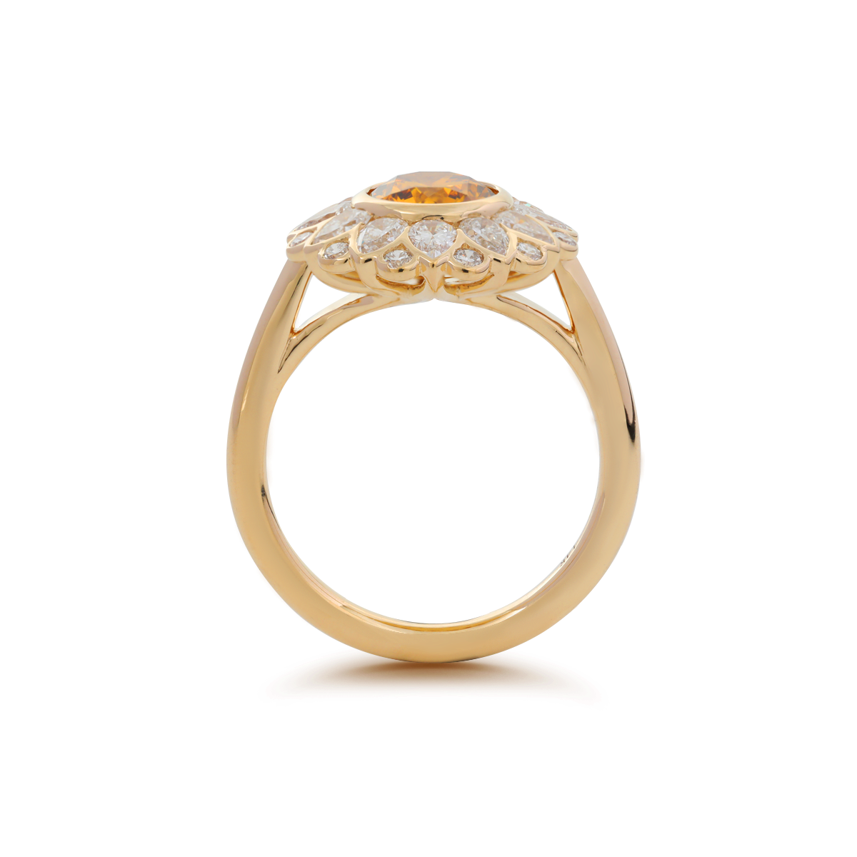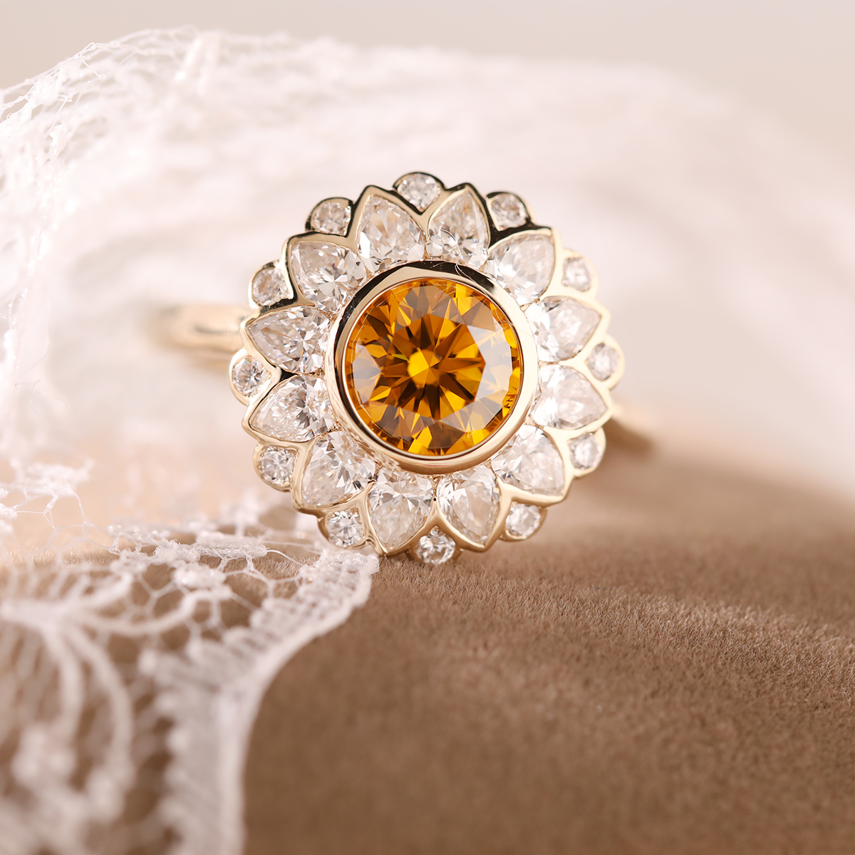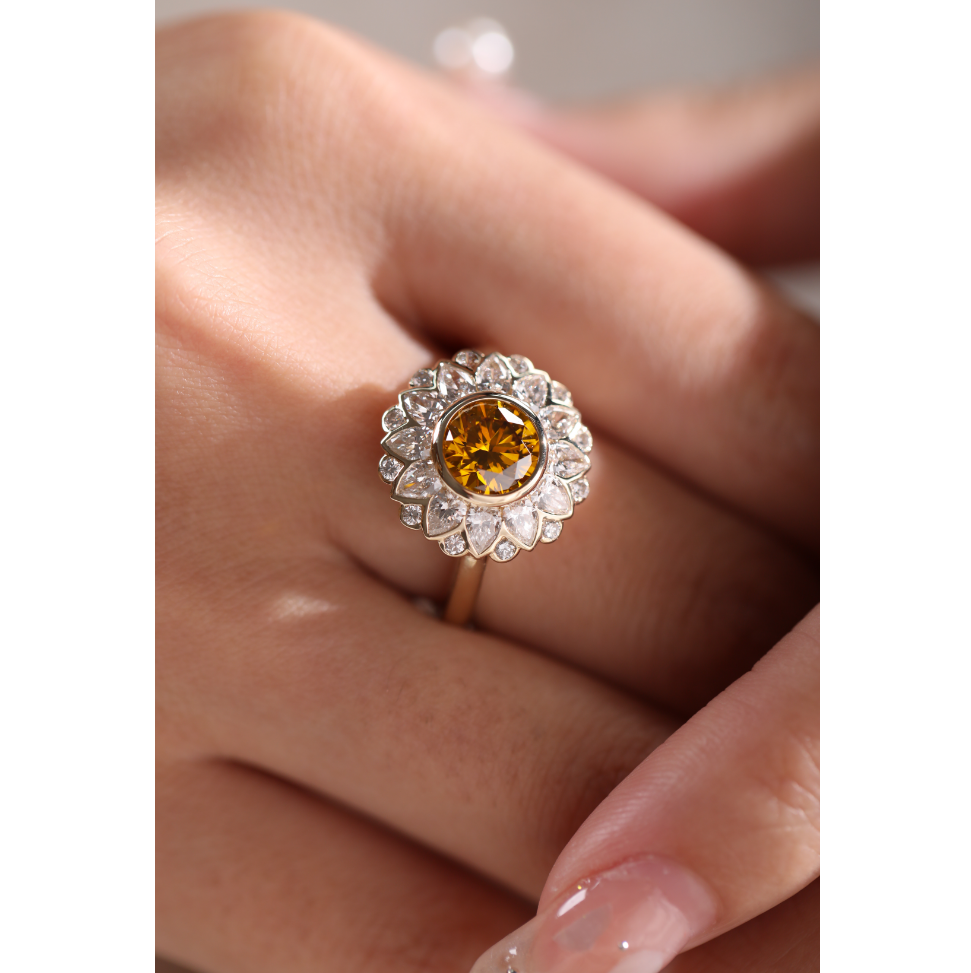 Embrace the beauty of nature with this 14K Yellow Gold 1.5ct Round Cut Yellow Lab Diamond Sunflower Halo Ring. Inspired by the radiant sunflower, this exquisite piece features a 1.5-carat round-cut yellow lab-created diamond, symbolizing warmth and positivity. The intricately designed halo, resembling sunflower petals, is adorned with shimmering white lab diamonds, enhancing its brilliance and charm. Crafted in 14K yellow gold, the setting complements the vibrant center stone, creating a harmonious and nature-inspired design. Perfect for engagements, anniversaries, or unique jewelry lovers, this sunflower halo ring is a timeless statement of elegance and sustainability.