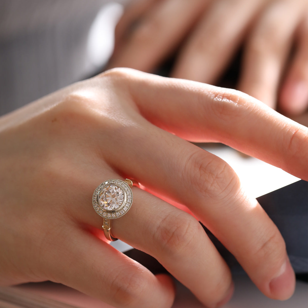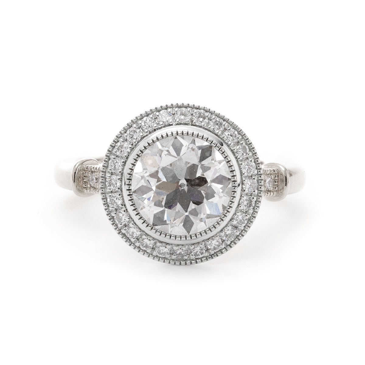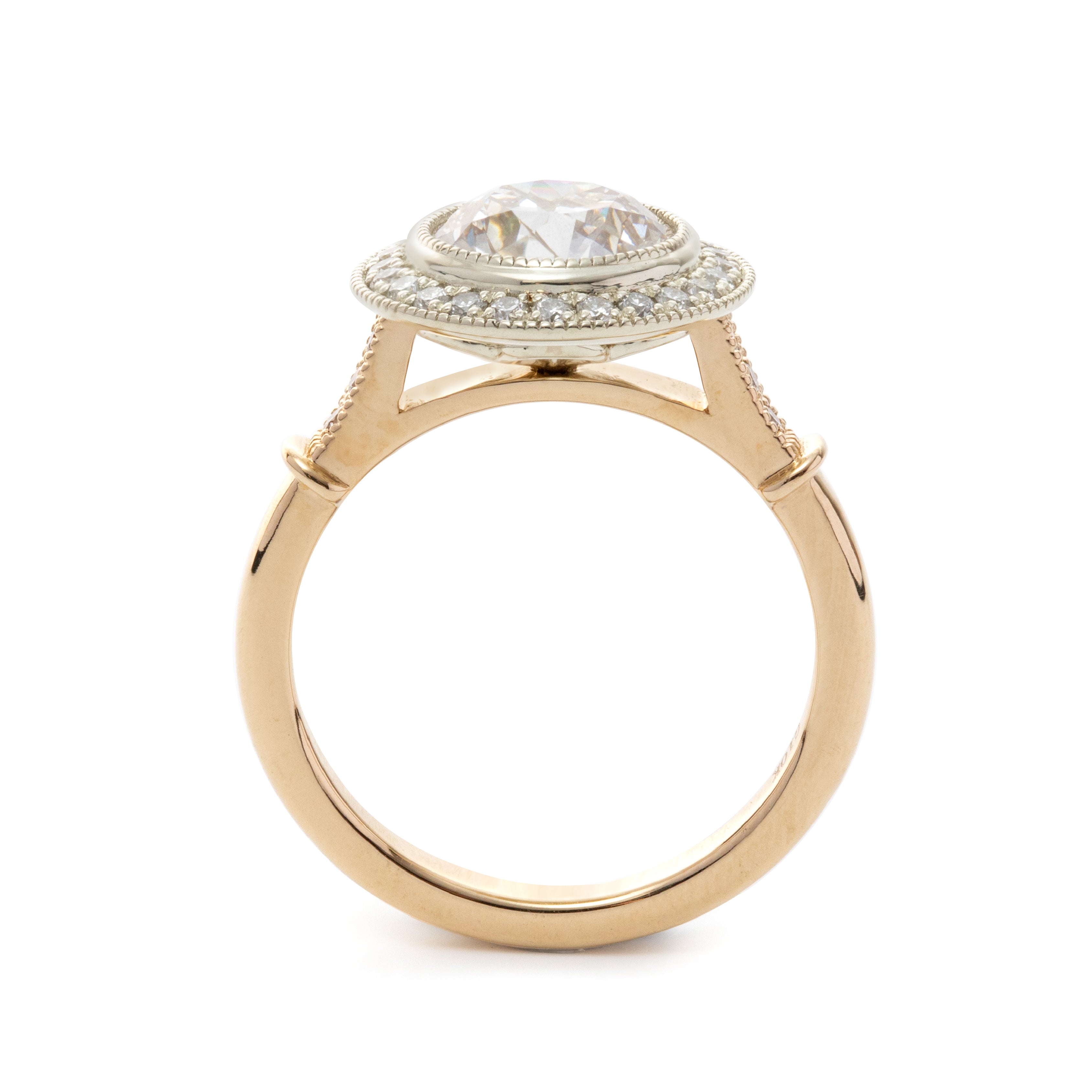 Embrace the elegance of a bygone era with this vintage-inspired masterpiece. Crafted in 14K yellow gold, this ring showcases a breathtaking 2ct Old European Cut lab diamond, radiating timeless brilliance. A delicate 14K white gold round diamond halo enhances its glow, adding depth and sophistication. Intricate millegrain detailing along the edges evokes classic antique charm, making this piece a true heirloom treasure.