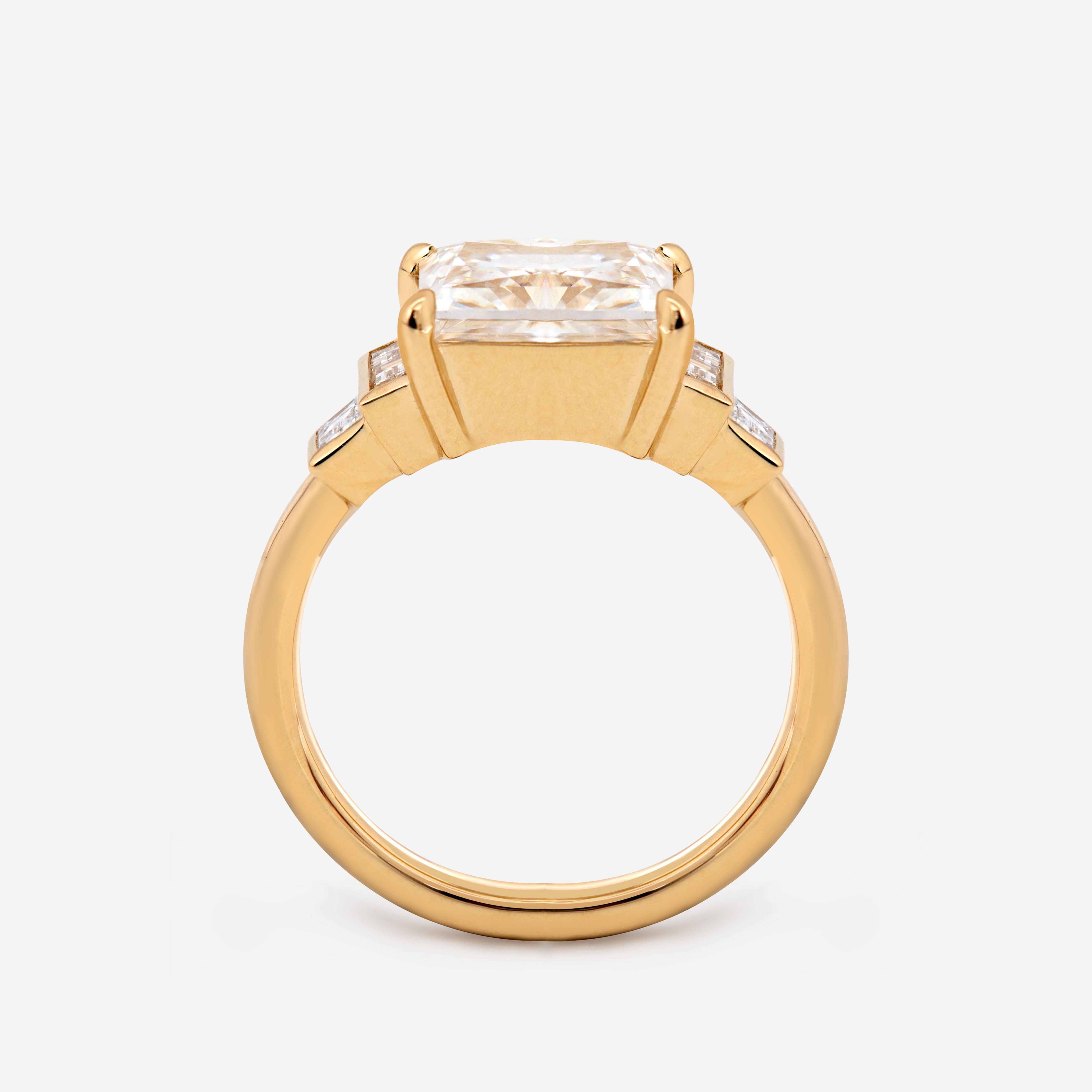 Dramatic and refined, this 14K yellow gold ring showcases a bold 3.5-carat princess cut lab diamond, admired for its striking geometry and radiant brilliance. Flanked by baguette cut side stones, the design balances modern elegance with timeless sophistication. The clean lines of the princess cut sparkle with contemporary flair, while the tapered baguettes draw the eye toward the center, enhancing its commanding presence. Ethically crafted with lab-created diamonds, this ring embodies beauty with responsibility. Perfect as an engagement ring or statement piece, it’s a celebration of strength, luxury, and everlasting love.