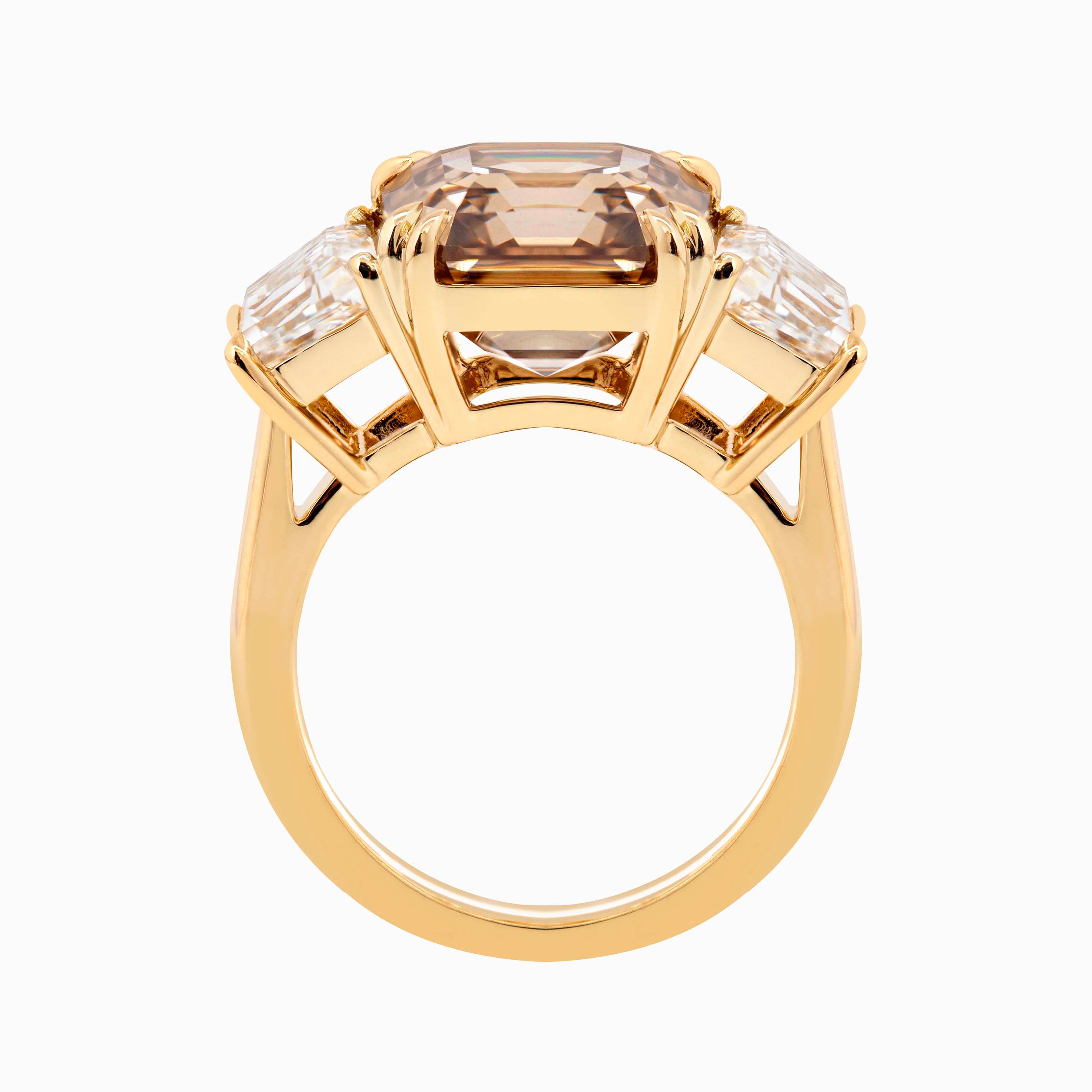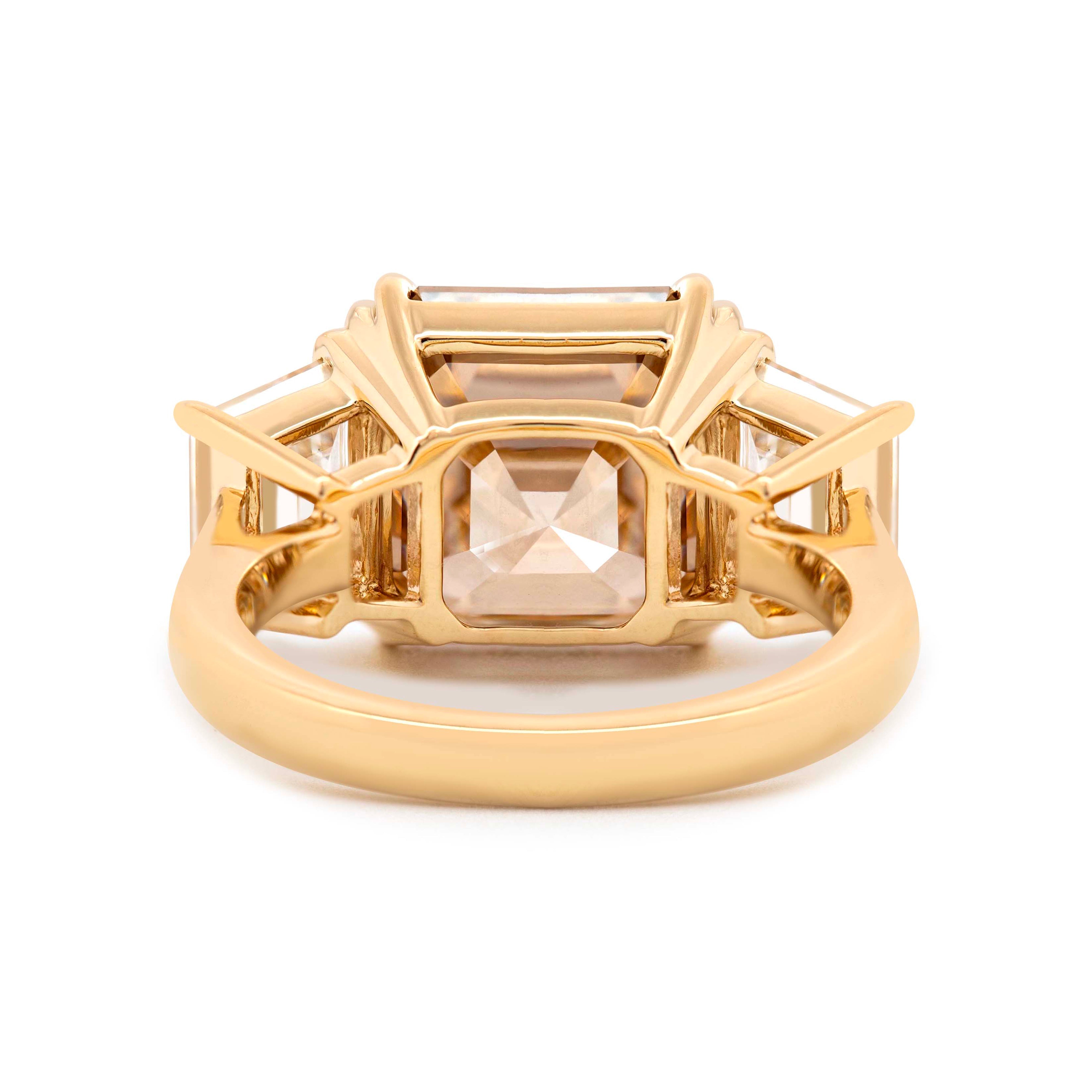 Command attention with this extraordinary 14K yellow gold three-stone ring, centered by a 1.74-carat Asscher cut brown lab diamond. Set with double claw prongs for both strength and elegance. The warm tones of the metal enhance the diamond’s rich depth and geometric brilliance, while the side stones bring a refined balance and subtle sparkle. A modern nod to classic design, thoughtfully created for meaningful moments and everyday significance.