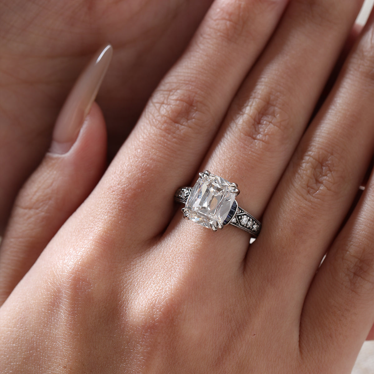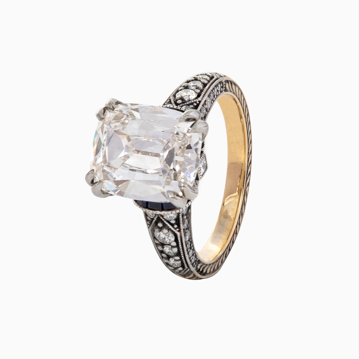 This 18K Gold Antique-Inspired Ring showcases a stunning 4.5ct elongated Old Mine Cut lab-grown diamond as its centerpiece, radiating vintage charm with romantic facets. Flanking the center stone are regal princess cut lab sapphires, their deep blue hue creating a striking contrast. Sparkling round cut lab diamond side-stones add brilliance and balance, while the intricate antique-inspired detailing on the band enhances its heirloom appeal. A luxurious statement piece that blends historic elegance with modern craftsmanship.