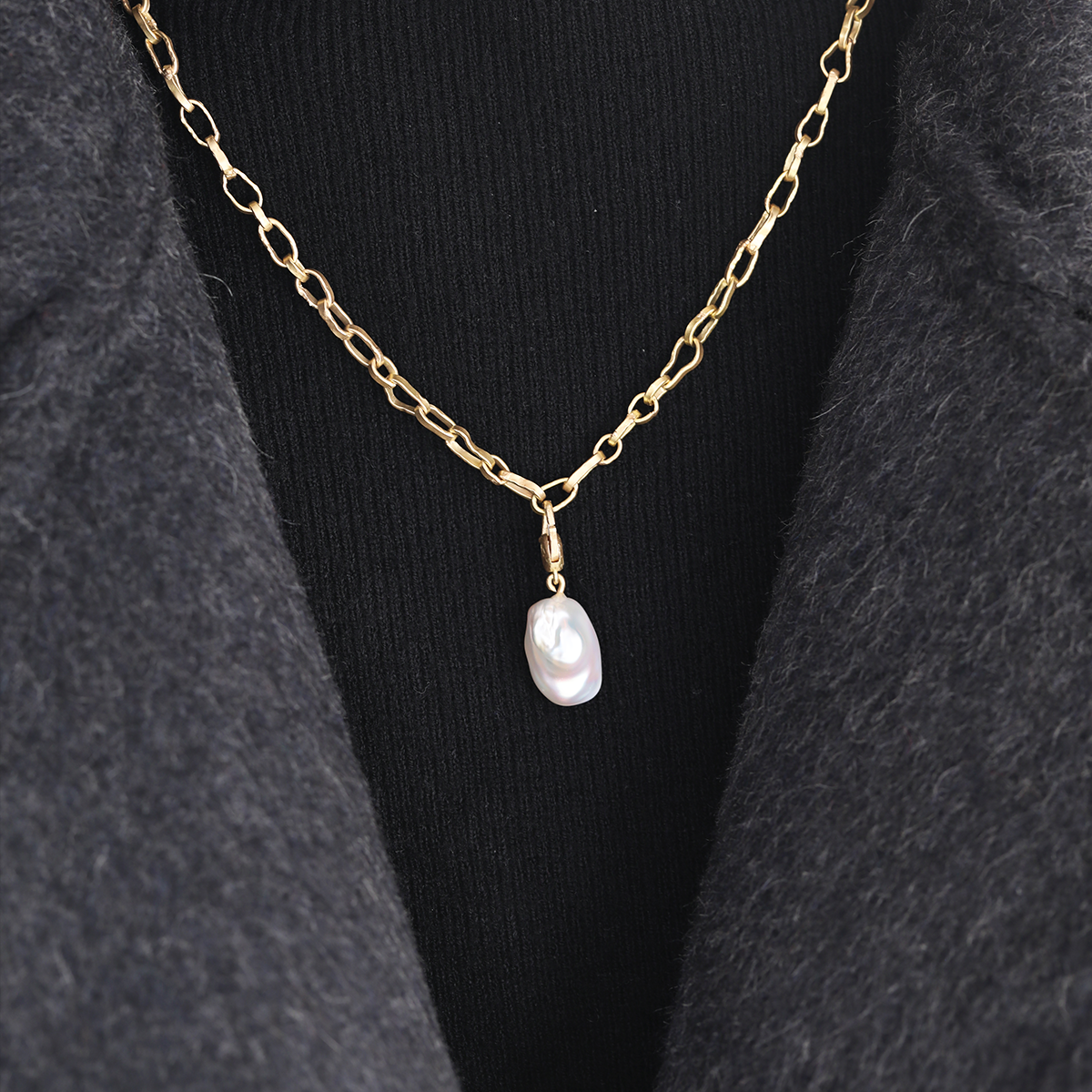 Organic elegance meets artisan craftsmanship in our 18K Yellow Gold Baroque Pearl Pendant Necklace. Featuring a lustrous, one-of-a-kind baroque pearl, this pendant hangs gracefully from a handcrafted irregular-shaped gold chain, adding texture and individuality to the design. The rich glow of 18K yellow gold complements the pearl’s natural beauty, creating a striking balance of refinement and raw charm. Perfect for those seeking unique pearl necklaces, artisanal fine jewelry, or timeless pieces with modern character and sustainable luxury.