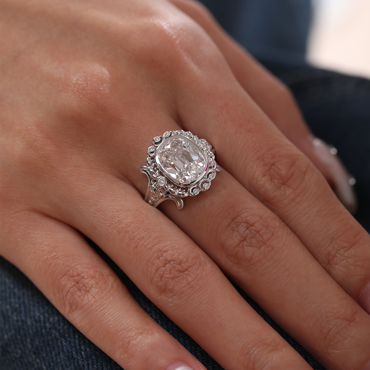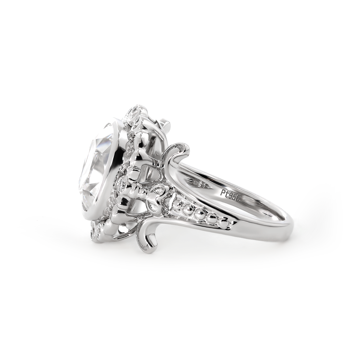 This Platinum Antique-Inspired Ring showcases a striking 4.5ct elongated lab-grown diamond, its lengthened silhouette creating a graceful, finger-flattering presence. Set in lustrous platinum for maximum durability and a cool-toned elegance, the design draws from vintage artistry with intricate detailing that evokes heirloom charm. A harmonious blend of timeless romance and modern refinement, this piece is made to be treasured for generations.