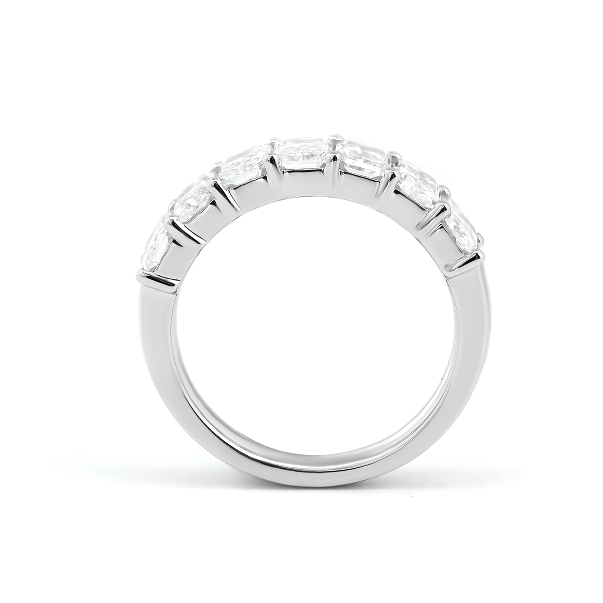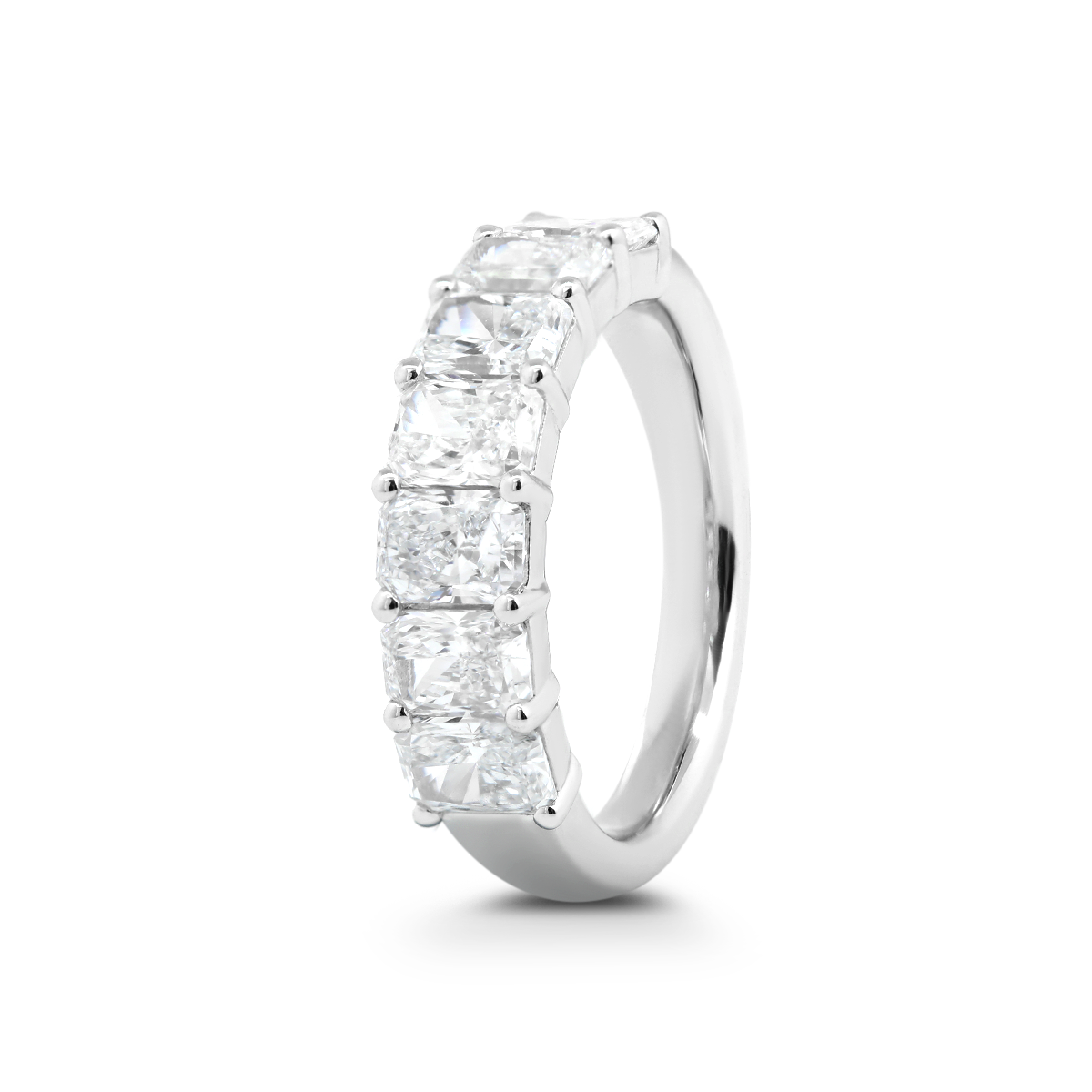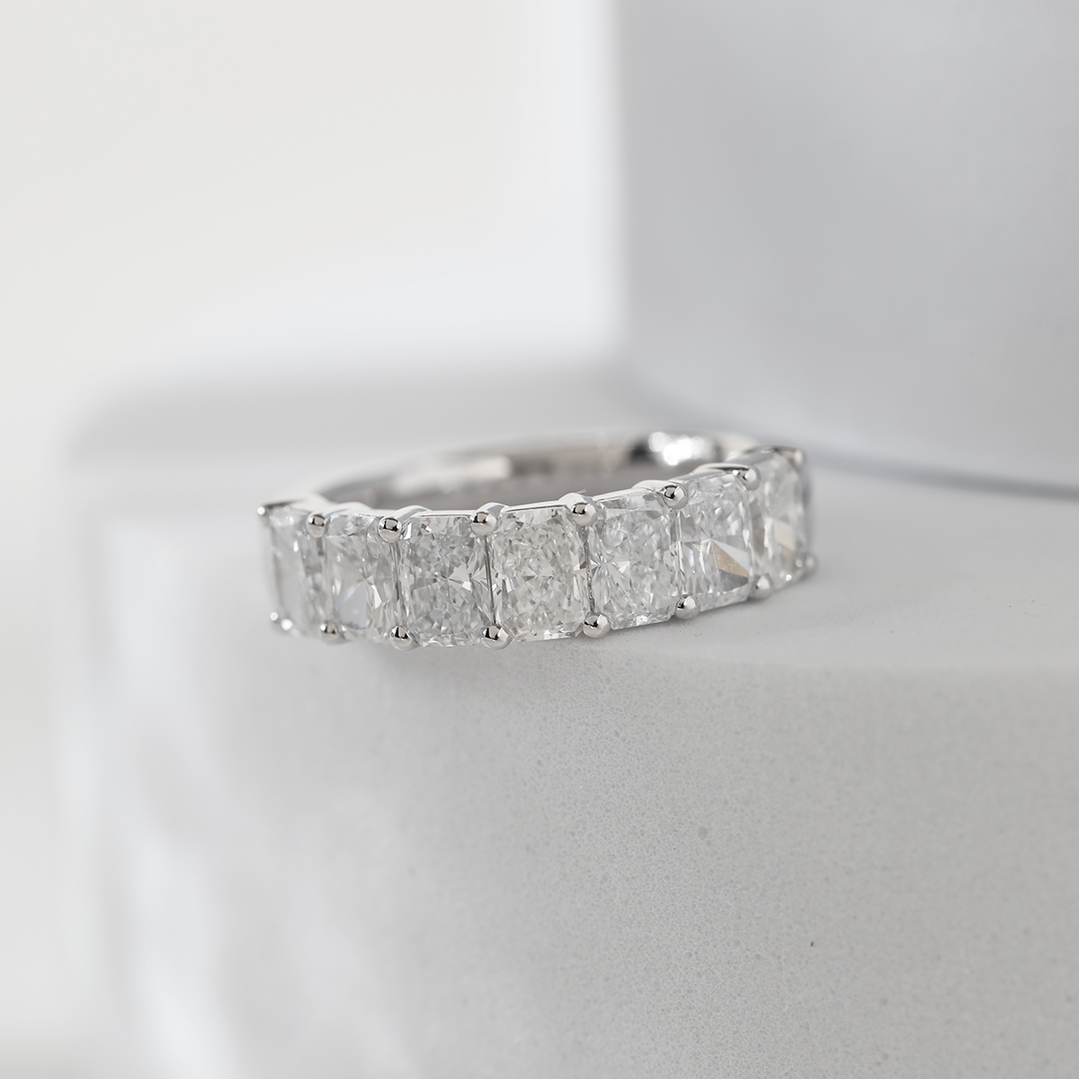 Bold yet timeless, our Platinum 7-Stone Half Eternity Ring features a striking row of radiant cut lab-grown diamonds, totaling elegant brilliance across the band. Each stone is meticulously set to maximize sparkle, while the cool sheen of platinum enhances their fire and clarity. Perfect as a wedding band, anniversary ring, or luxurious stackable piece, this design is ideal for those seeking radiant cut diamond rings, 7-stone eternity styles, or sustainably crafted fine jewelry with lasting sophistication and brilliance.