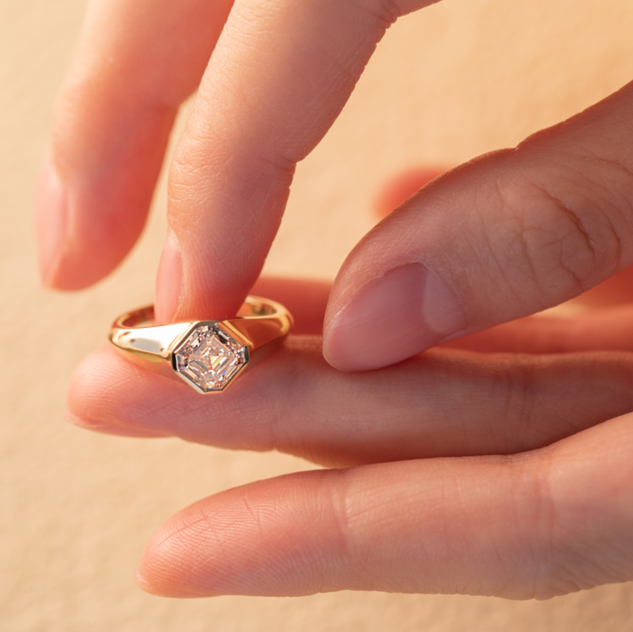Sleek and sculptural, our 14K Yellow Gold Bezel Ring showcases a 1.5ct Asscher cut lab-grown diamond in a clean, modern bezel setting. The bold center stone is complemented by a knife-edge tapered band that adds architectural dimension and contemporary elegance. Crafted in rich yellow gold, this ring balances vintage-inspired geometry with minimalist sophistication. Perfect as a modern engagement ring or statement piece, it’s ideal for those seeking Asscher cut diamond rings, bezel-set styles, or sustainable fine jewelry with a refined edge.